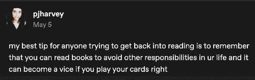 i have read so much in the last two months it's almost unbelievable. that one post that's like it's crazy how much you can read if you read. yeah. that's me. i have to read ~14 books/month to catch up in time for my goal, which sounds crazy but since i'm not in school it's not so difficult to power through 50-70 pages/day. i have high hopes, but at the very least (barring some horrifying, unforeseen life even that sets me back) i'm on track to beat last year's book count, which is nice. reading really is a muscle and it's also incredibly enjoyable once you get past the initial barrier of making a habit of picking up your book instead of your phone.