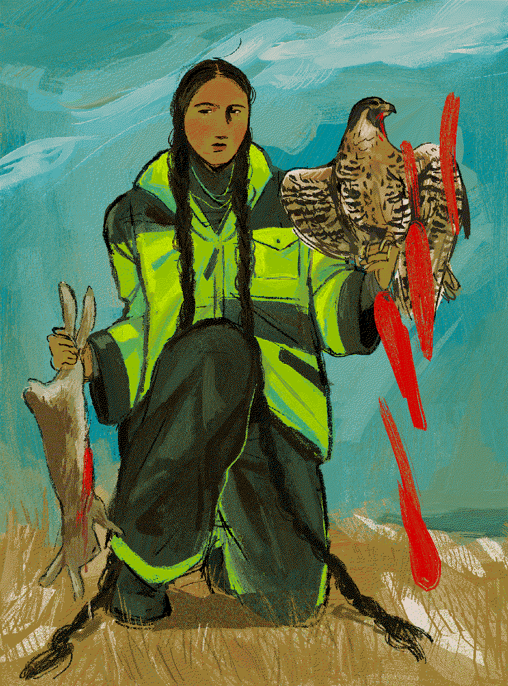 Fig. 1. Peregrine has returned, spiraling in on the only plane that still makes the trip out here. As I watch it land, I imagine him as the falcon he is named for, wild and steady. His smiling amber eyes as he drops, talons gripping the soft fake flesh of my curled hand. In human form, he hugs me outside the hangar, bird boned and warm even through his parka, gripping me tight. I find him remarkable, alive, smelling dependably of lavender soap.